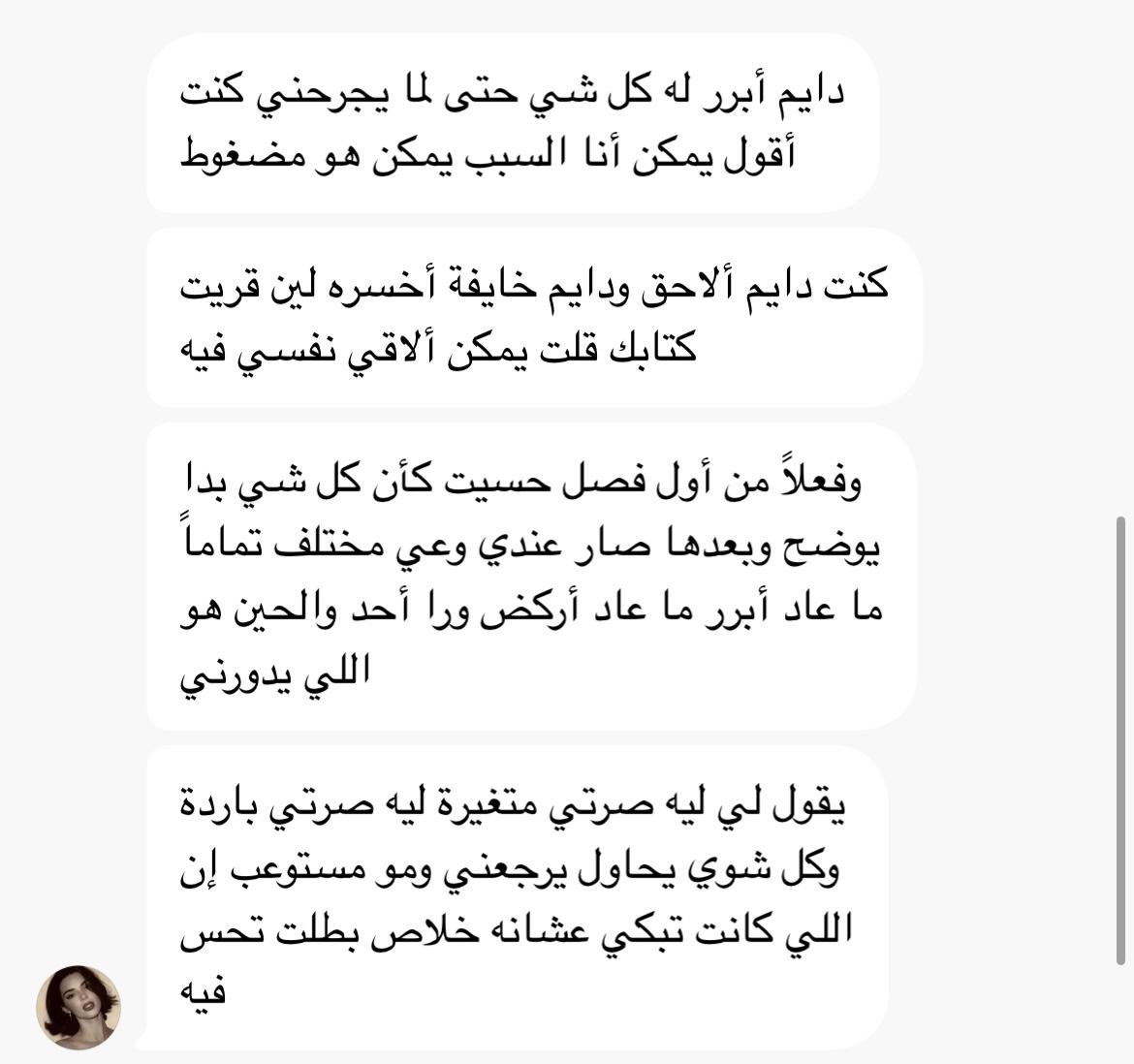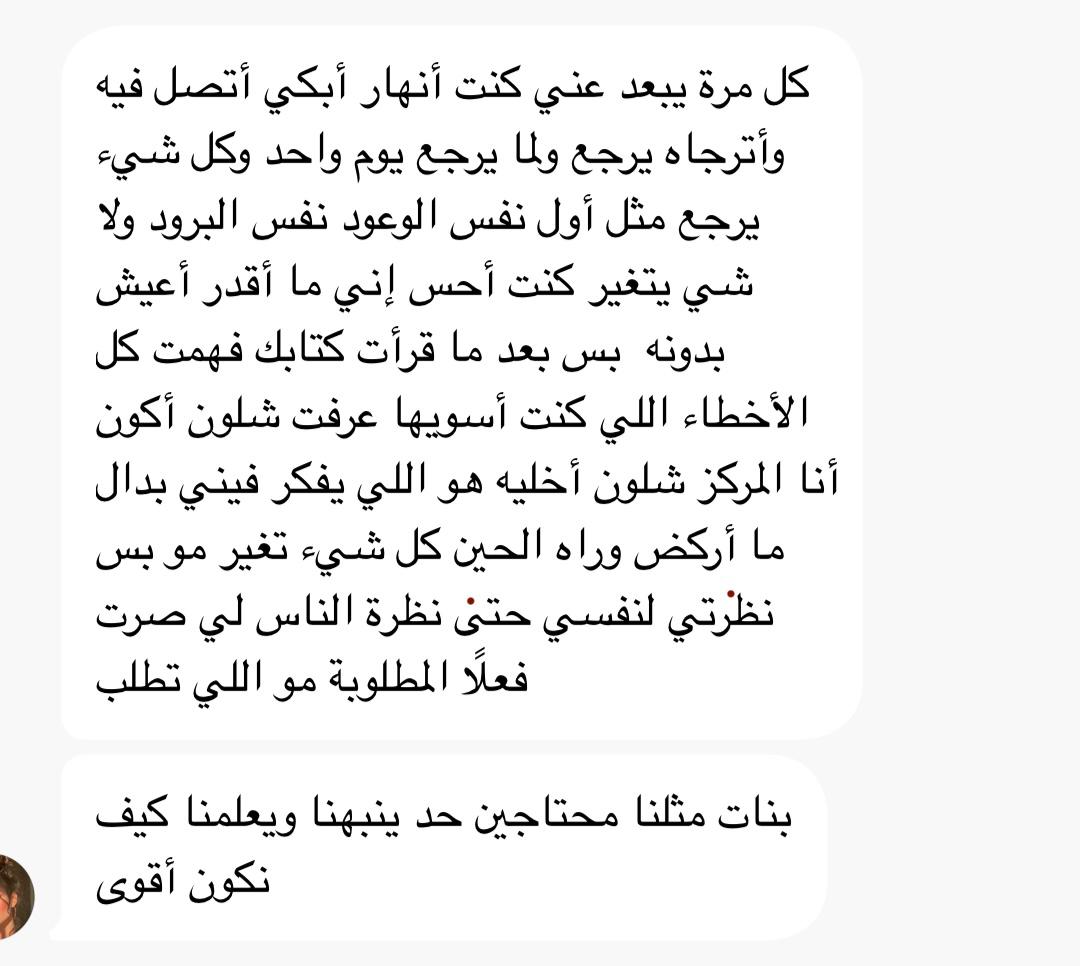 دايم ابرر له كل شي حتى لما يجرحني كنت اقول يمكن انا السبب يمكن هو مضغوط كنت دايم الاحق ودايم خايفه اخسره لين قريت كتابك قلت يمكن الاقي نفسي فيه وفعلا من اول فصل حسيت كأن كل شي بدا يوضح وبعدها صار عندي وعي مختلف تماماً ما عاد ابرر ما عاد اركض ورا احد والحين هو اللي يدورني يقول لي ليه صرتي متغيره ليه صرتي بارده وكل شوي يحاول يرجعني ومو مستوعب ان اللي كانت تبكي عشانه خلاص بطلت تحس فيه