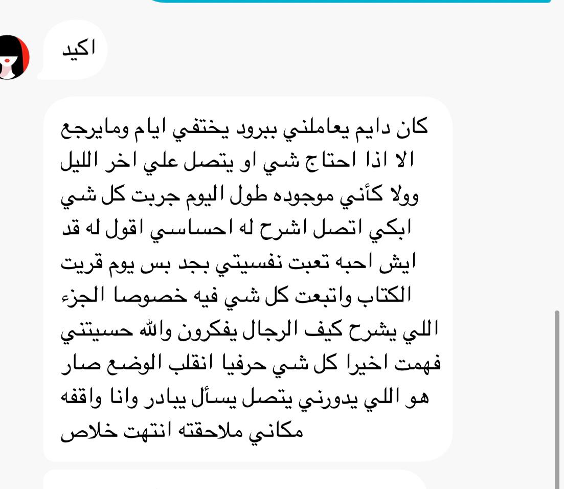 تخيلي كان يتركني بالايام ما يرد علي ويقول مشغول وانا كنت احس اني السبب واعتذر له دايم واقول له يمكن انا ضيقتك بس لما قريت الكتاب فهمت اني كنت اعطي انسان ما يستحق صار عندي وعي ووقفت كل شي فجاه هو اللي صار يسال وينك ليه متغيره ليه ما تردين الحين هو يقول لي انه يخاف علي ويحسب لي الف حساب