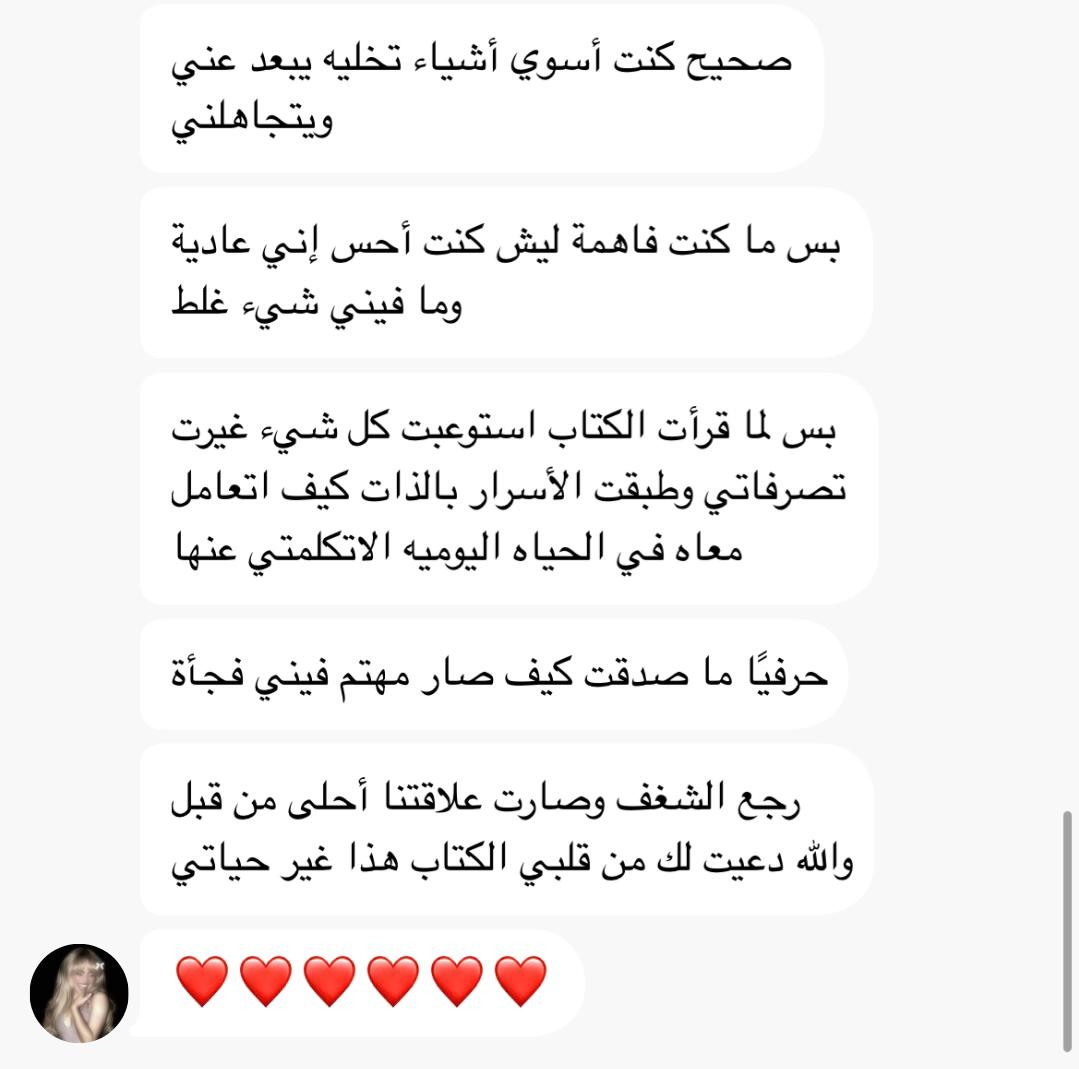 ما عندك فكرة كيف أنا مبسوطة ما بعرف كنت فين طول السنين دي كنت في علاقة 8 سنين ونص وكان في مشاكل كثيرة بيننا لكن بعد ما قريت كتابك فتحت عيوني على حاجات كتيرة وخلاني أغير طريقة تفكيري وأشوف الأمور بصوره مختلف أنا ممتنة ليك جداً اللّٰه يسعدك