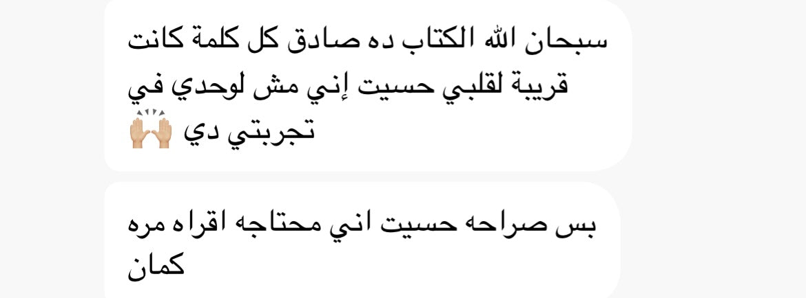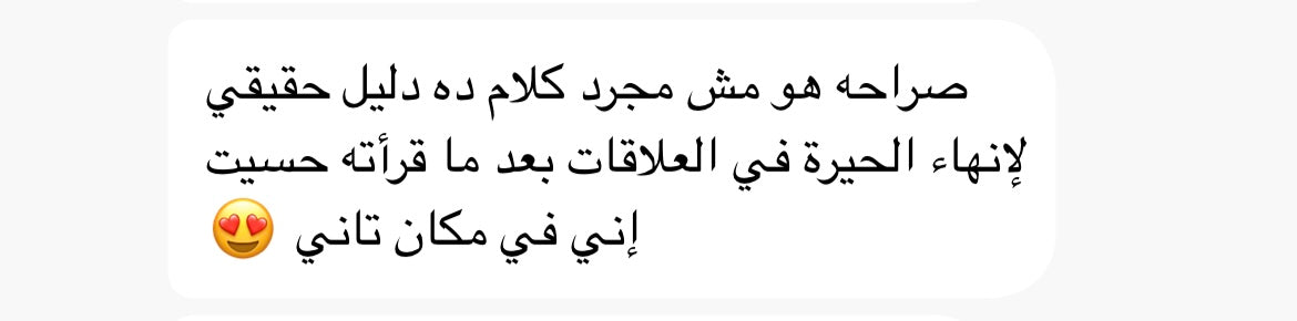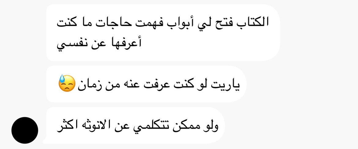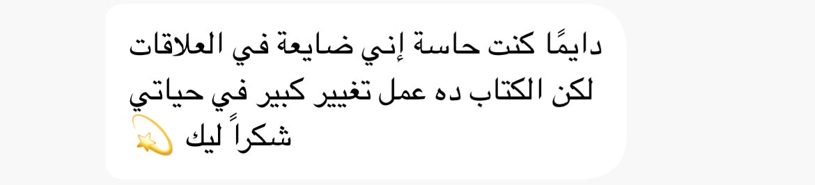 ما عندك فكرة كيف أنا مبسوطة ما بعرف كنت فين طول السنين دي كنت في علاقة 8 سنين ونص وكان في مشاكل كثيرة بيننا لكن بعد ما قريت كتابك فتحت عيوني على حاجات كتيرة وخلاني أغير طريقة تفكيري وأشوف الأمور بصوره مختلف أنا ممتنة ليك جداً اللّٰه يسعدك