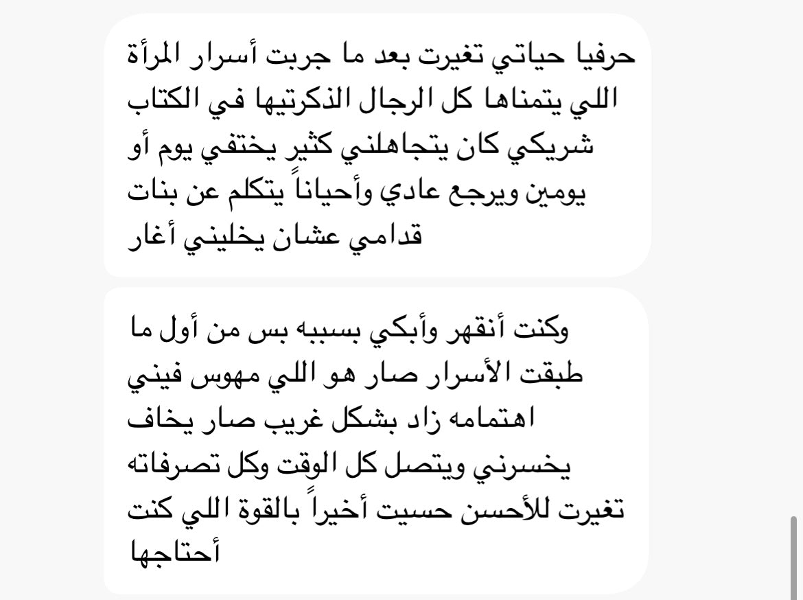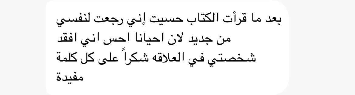دايم ابرر له كل شي حتى لما يجرحني كنت اقول يمكن انا السبب يمكن هو مضغوط كنت دايم الاحق ودايم خايفه اخسره لين قريت كتابك قلت يمكن الاقي نفسي فيه وفعلا من اول فصل حسيت كأن كل شي بدا يوضح وبعدها صار عندي وعي مختلف تماماً ما عاد ابرر ما عاد اركض ورا احد والحين هو اللي يدورني يقول لي ليه صرتي متغيره ليه صرتي بارده وكل شوي يحاول يرجعني ومو مستوعب ان اللي كانت تبكي عشانه خلاص بطلت تحس فيه
